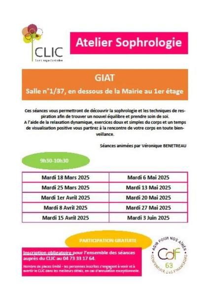 Ces séances permettront de découvrir la sophrologie et les techniques de respiration. La sophrologie contribue à retrouver son équilibre intérieur et de prendre soins de soi. Véronique Benetreau animera les séances. Organisé par le CLIC de Riom.