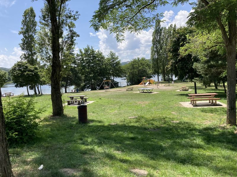 Aire de jeux pour enfants avec toboggan, balançoire, table de tennis de table et petites structures d’escalade.