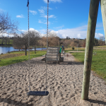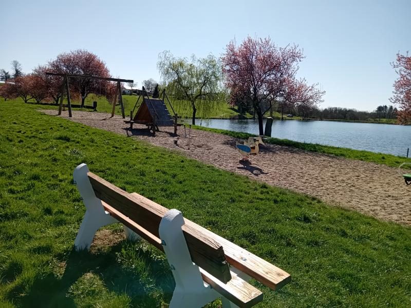 L'aire de jeux se situe au bord du plan d'eau de la Prade, site ombragé avec des tables de pique-nique. Tout proche du restaurant. Petite plage - baignade surveillée. Village à moins d'un kilomètre.