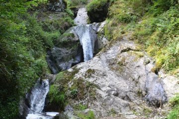4/ S’engager dans la rue à gauche, passer devant une stèle et poursuivre à droite sur le chemin qui longe la Sioule et mène à la cascade des trois cuves. Revenir sur ses pas, et à hauteur de la stèle, monter à droite entre les maisons du hameau. Traverser la D 513 et poursuivre la montée tout droit. À une fourche, continuer à gauche pour rejoindre la D 513. Obliquer encore à gauche pour revenir au point de départ.