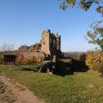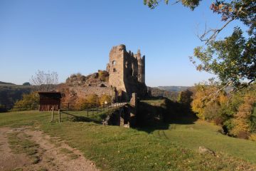 3/ Suivre la route à gauche sur 400 m. Dans un virage à gauche en face d’un parking, la quitter pour monter sur la gauche un sentier dans les bois. Passer devant les ruines de Château Rocher (de l’intérieur du château, belle vue sur les gorges de la Sioule et le Pont de Menat). Continuer jusqu’à Blot-Rocher.