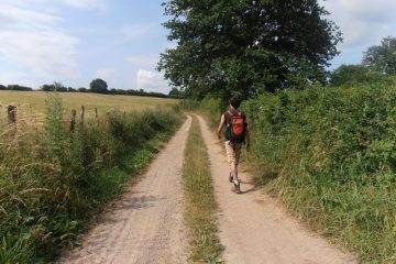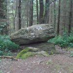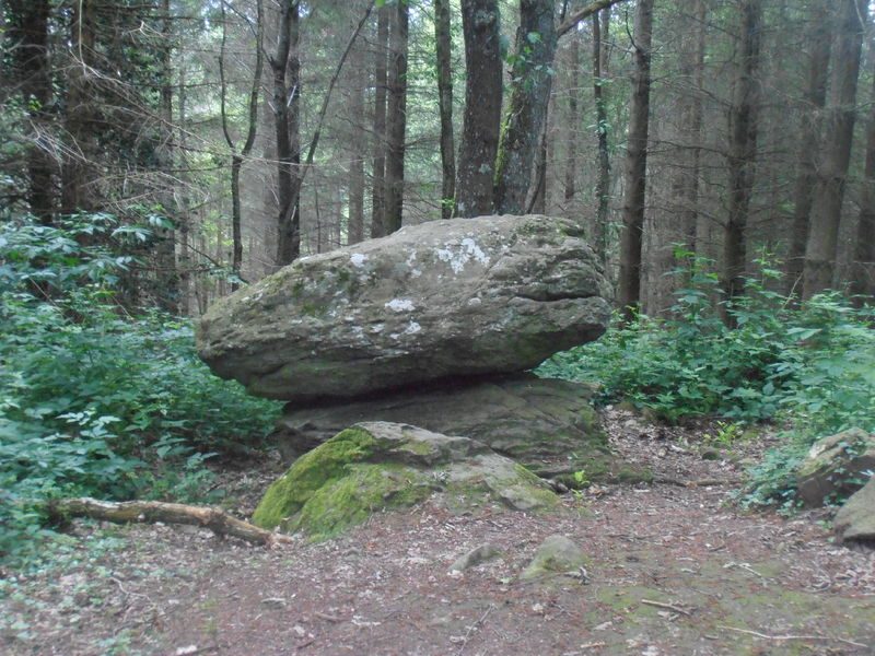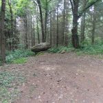 2 – Tourner à gauche puis, au carrefour suivant, prendre à gauche la route sur une centaine de mètres puis à droite la « rue des Jouffrets ». Dans le virage après la ferme, descendre le chemin à gauche, jusqu’au ruisseau de l’Aise. Franchir le gué, obliquer à droite et monter le raidillon en forêt. Après un replat et une nouvelle montée, lorsque le sentier va amorcer une légère descente, l’abandonner pour monter à droite. Aux maisons, emprunter la rue « chemin de Côte Meunier ». Dans le virage, poursuivre en face sur le « chemin de la Pierre branlante ». À la fourche, rester à l’orée de la forêt. À proximité d’un site mégalithique, continuer sur le chemin et, au panneau indiquant la pierre, emprunter le sentier à droite pour atteindre, à 100 m, la Pierre branlante.