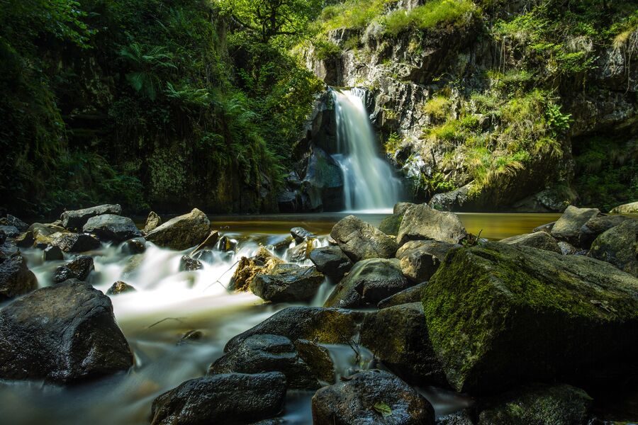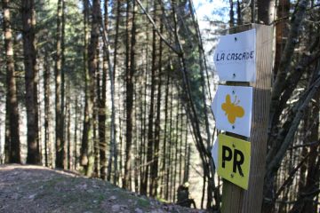 3/ S’engager en face dans le sentier pentu qui rejoint le ruisseau de l’Auzelle. Remonter le cours du ruisseau, le traverser à trois reprises par les passerelles aménagées pour aller jusqu’à la cascade.