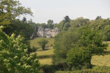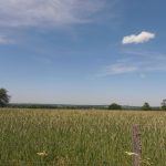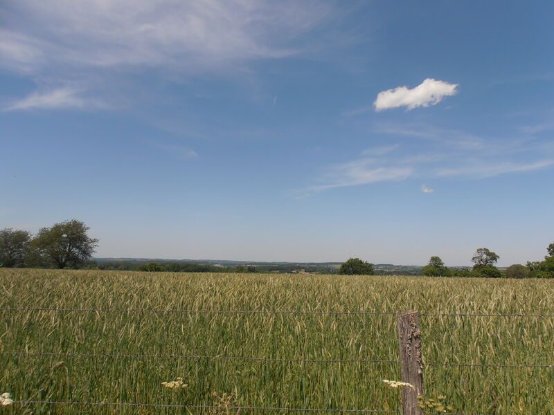 3/ Le suivre à droite sur 50 m puis, à la croix, emprunter le chemin à gauche. Traverser une zone boisée et à la sortie (50m avant une route) descendre à droite un sentier herbeux. Traverser la route et continuer en face. Dans la descente, tourner à gauche à la première intersection et rejoindre un large chemin. L’emprunter à gauche. À la fourche aller à gauche, ignorer un chemin à gauche et monter jusqu’à une intersection. Tourner à droite et aller toujours tout droit jusqu'à un chemin montant à gauche avant une ferme.