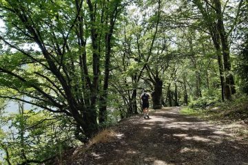 1/ Du panneau de départ sur le parking, suivre le chemin empierré qui longe la retenue en direction de la plage du Pont-du-Bouchet. Après 300 m, à la fourche, obliquer à droite (vue sur la retenue et le confluent Sioulet-Sioule). Au bâtiment (sanitaires), monter le chemin à droite jusqu’à une petite route.