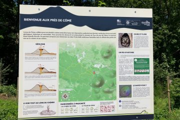 Depuis l’entrée de Vulcania, continuer sur la D559, direction Mazayes, sur 1,4km. Panneau de départ / parking à 50 m à droite.