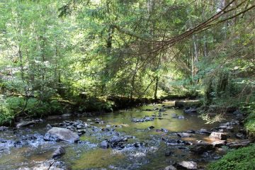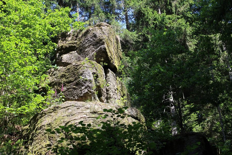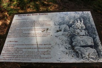 3/ Aller à gauche, traverser le pont et emprunter le sentier à droite pour accéder au site Le Rocher des Trois Tourtes. Rebrousser chemin, repasser sur le pont et monter à gauche dans les bois. Ignorer un chemin à droite. À une intersection en T continuer à droite jusqu'à une grande clairière.