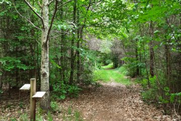large chemin gravillonné. Traverser une route et poursuivre en face sur le sentier forestier. Un