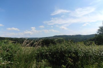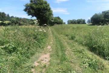 2 – Traverser, poursuivre sur la piste en face et descendre en ignorant des chemins de part et d’autre (autre circuit) jusqu’à une intersection en T. Se diriger à gauche sur 100m puis aller à droite. Entrer dans le bois, à la première intersection tourner à droite et, à la fourche, virer à gauche. Descendre en laissant des chemins de part et d’autre jusqu’à la route (autres circuits).