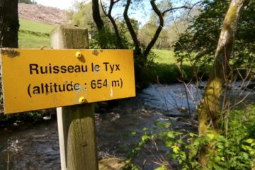 6/ Obliquer à droite, et 20 m plus loin à gauche. Descendre, longer le Tyx, le traverser. Remonter le long d’un bois à main gauche. Rejoindre un large chemin, le suivre à gauche pour revenir à Condat.