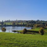 Aller à droite sur la route et à 100m se diriger à gauche vers le plan d’eau. A la fourche descendre à droite et continuer à gauche sur la petite route. Longer le restaurant, laisser un chemin à droite et emprunter le suivant. Poursuivre entre le camping et le terrain de foot. Passer devant l’entrée du camping et, juste après, prendre le chemin qui descend à droite pour rejoindre le plan d’eau.