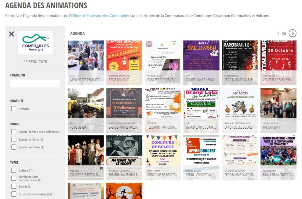 J’ai un hôtel et mes clients me demandent régulièrement les animations prévues, ou encore les visites à proximité. Je peux afficher un widget des animations de ma communauté de communes, ou d’un rayon kilométrique, ou de toutes les Combrailles sur mon site. Et avec un widget des sites de visite, au moment de la réservation, les clients potentiels pourront voir les animations pour le week-end où ils souhaitent venir, et programmer leurs visites !