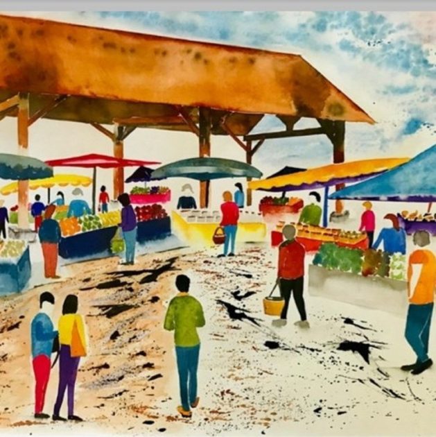 Marché de pays associant producteurs et artisans locaux avec des produits laitiers, des fruits et légumes, des produits de la ruche, des jus de fruits, des plants, du pain, des œufs, de la bière, etc... .