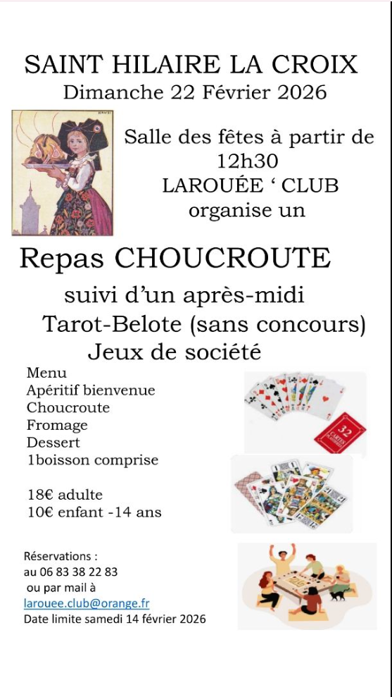 Larouée'club organise un repas choucroute suivi d'une après midi Tarot, belote et jeux de société. Date limite de réservation le 14 février.