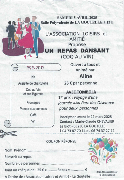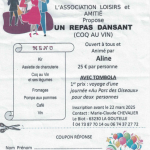L'association Loisirs et amitié organise un repas dansant, ouvert à tous et animé par Aline. Inscriptions avant le 22 mars 2025.