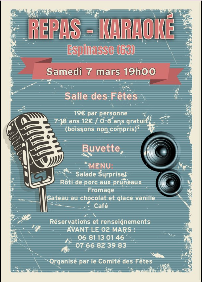 Le comité des fêtes organise un repas karaoké. Au menu : Salade surprise, rôti de porc aux pruneaux, fromage, gâteau au chocolat et glace vanille, café.