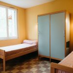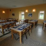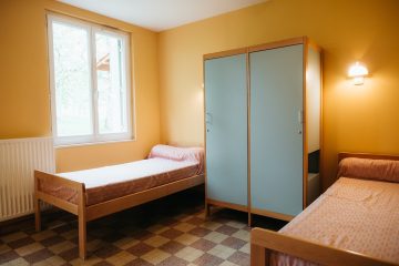 - Le bâtiment principal, avec, en rez-de-chaussée, 1 salle de réunion, 1 salon multi-activités, 1 chambre PMR, la cuisine professionnelle, 2 salles-à-manger (15 et 60 places), sanitaires. À l’étage, 2 couloirs desservent les chambres (4) ou dortoirs (10) et les sanitaires.