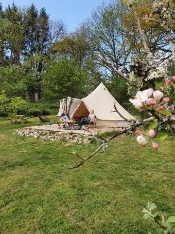 Le 'nouveau camping' tout confort. Louez notre tente (type Bell) toute équipée, l'hirondelle (2 pers) ou l'aigle (4 pers) sur un petit camping de 2 ha avec 8 emplacements au total. Profitez aussi de la cuisine d'été et de notre sauna finlandais.