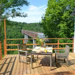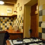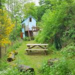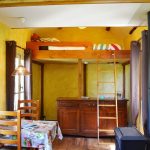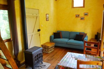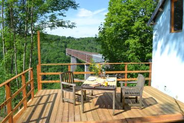 Gîte de charme avec lit en hauteur. Une maison petite, mais complète. Cuisine, salle de bains avec douche et lavabo, partie séjour avec coin table à manger et coin canapé avec cheminée. Terrasse et terrains avec salon de jardin et vue sur le viaduc.