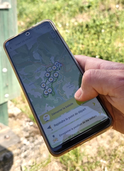 Avant le départ, nous avons téléchargé les contenus, pour profiter de l’application et du guidage même sans connexion. Et on a pu utiliser la fonctionnalité « Rejoindre le point de départ » et le GPS intégré pour trouver le panneau de départ sans se perdre !