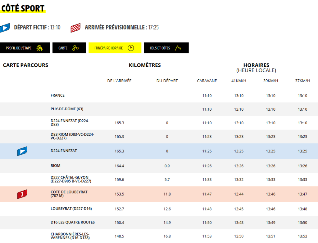 Estimations horaires de passage caravane et cyclistes