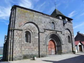 Bâtie au XIIe siècle par le comte d'Auvergne Robert III, cette église faisait partie d'une imposante forteresse aujourd'hui disparue. Ce vaste édifice est marqué par les influences du Limousin proche. Le portail occidental a gardé ses pentures anciennes. Un imposant escalier de quinze marches permet d'accéder à la nef. Les bas-côtés sont éclairés par de vastes "oculi" (ouvertures ronde qui font entrer la lumière extérieure).