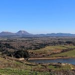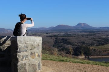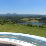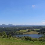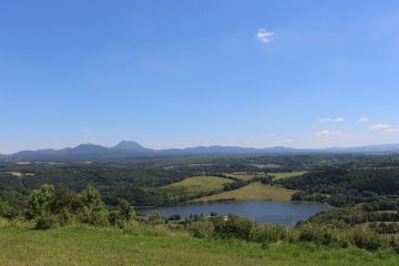 Magnifique panorama sur le lac de barrage d’Anschald, la Chaîne des Puys et le Massif du Sancy offert depuis le Puy de Moufle. La table d’orientation en lave émaillée permet de repérer ce qu’on a sous les yeux.
